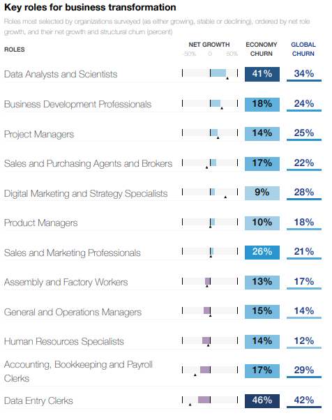 Según el informe elaborado por el WEF, se proyecta que la rotación estructural de la fuerza laboral en los próximos cinco años sea del 17%, seis puntos porcentuales por debajo del promedio global. En concreto, se espera que el puesto de científico de análisis de datos sea el rol con el mayor aumento, con un incremento del 41% en el número de profesionales en esta área. También se anticipa un aumento en la demanda de profesionales en desarrollo de negocio, con un incremento del 18%, y de gestores de proyectos, con un aumento del 14%.
