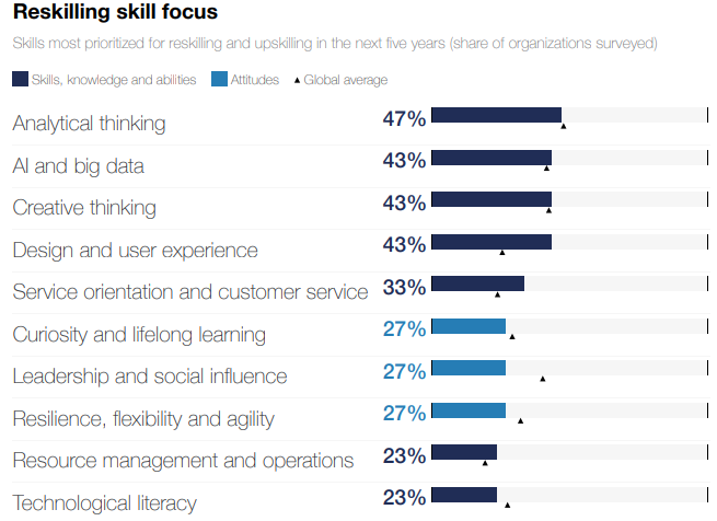 Si hablamos de las habilidades más prioritarias para el reciclaje y la mejora de las habilidades en los próximos cinco años, encontramos que la habilidad por excelencia a desarrollar por los trabajadores para mejorar su competencia será el pensamiento analítico, seguido en segunda posición por la Inteligencia Artificial y el Big Data, y en tercera posición el pensamiento creativo.