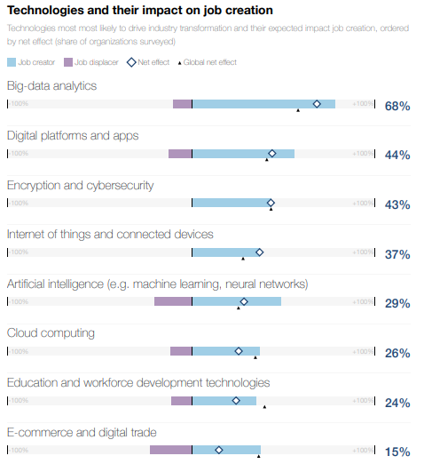 - Los mayores efectos de creación y destrucción de empleo proceden de las tendencias medioambientales, tecnológicas y económicas. El análisis de grandes volúmenes de datos (Big-data), las tecnologías de gestión del cambio climático y el medio ambiente, y el cifrado y la ciberseguridad serán los principales motores del crecimiento del empleo.