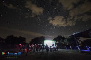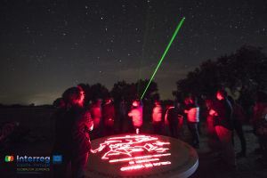 Bloque 2: Inicio de la Observación Astronómica en el Mirador de Estrellas del Centro de Interpretación de las Ruinas de Cáparra. Se hacen dos grupos para la correcta observación: uno primero, en horario de 23.00 a 00.30 horas, destinado principalmente a asistentes a la parte de tarde la jornada, y un segundo grupo, en horario de 00.30 a 02.00 horas, con asistentes a la jornada de tarde y, además, interesados y aficionados que se acercaron hasta el lugar.