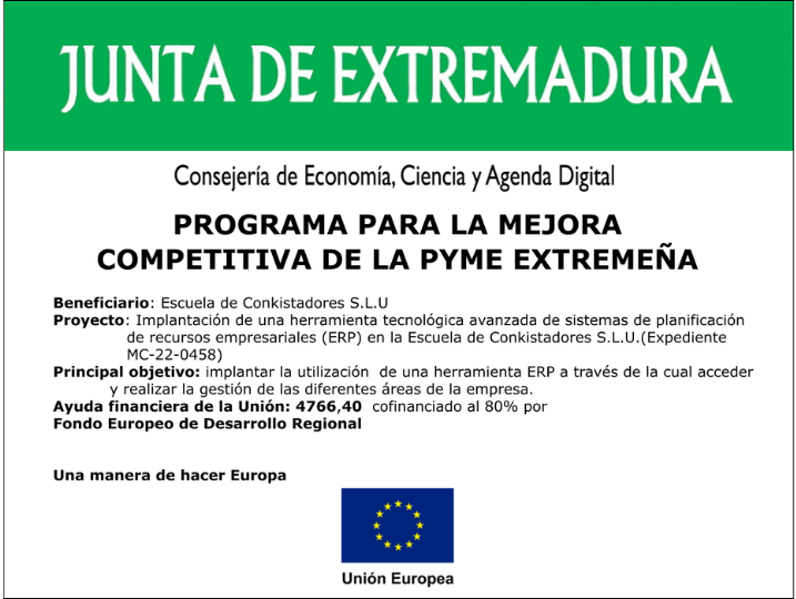 Este proyecto se ejecuta al amparo de la Orden de 29 de octubre de 2020 (DOE no 214, de 05/11/2020). Bases reguladoras de las ayudas para la puesta en marcha de un Programa para la Mejora Competitiva de la Pyme Extremeña, correspondiente a la Convocatoria 2022 de 23 de diciembre de 2021, y a la RESOLUCIÓN de  21 de agosto de 2019 (DOE Número 163, de 23 de agosto)  de la Secretaría General  está cofinanciado por la Comunidad Autónoma de Extremadura y del Fondo Europeo de Desarrollo Regional (FEDER).