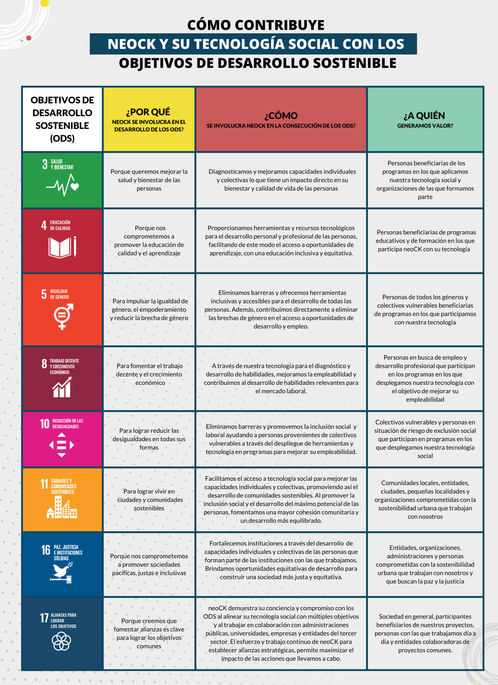 - Objetivo 10: Reducción de las desigualdades: ayudamos a personas provenientes de colectivos vulnerables proporcionando herramientas y tecnología en programas para mejorar su empleabilidad. Al eliminar barreras y promover la inclusión social, neoCK ayuda a reducir la brecha social.