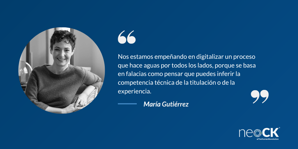 La propuesta de María para superar los procesos de selección sesgados es que las organizaciones dejen de enfatizar en el mismo modelo que, como ya se ha visto, está obsoleto: “Nos estamos empeñando en digitalizar un proceso que hace aguas por todos los lados, porque se basa en falacias como pensar que puedes inferir la competencia técnica de la titulación o de la experiencia”.